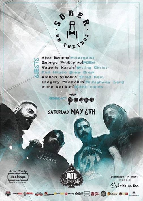 Το Σάββατο 6 Μαϊου δεν θα πραγματοποιηθεί “άλλη μία συναυλία”. Με τη βοήθεια εκλεκτών μονάδων, φίλων του σχήματος και διακεκριμένων μουσικών της εγχώριας underground σκηνής και με σύμμαχο τη συναυλιακή εμπειρία και την εκρηκτική τους διάθεση, οι Sober on Tuxedos θα ανέβουν στη σκηνή του φημισμένου υπογείου της πλατείας Εξαρχείων, του θρυλικού An Club, για να κάνουν αυτό που ξέρουν καλύτερα: Να μοιραστούν τη μουσική τους με τους φίλους τους, όλους αυτούς που στηρίζουν το σχήμα όλα αυτά τα χρόνια, αλλά και νεότερους.