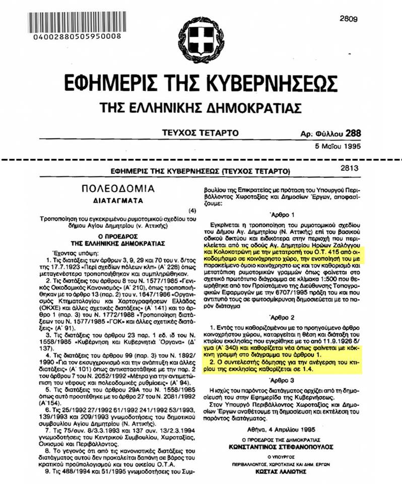 Το 1995 εκδίδεται το προεδρικό διάταγμα (Φ.Ε.Κ. 288/Δ) που προβλέπει εκτεταμένες αλλαγές στο κέντρο της πόλης, οριοθετεί το χώρο που θα καταλαμβάνει ο νέος ναός, ορίζει τον συντελεστή δόμησής του, ονοματίζει τις ιδιοκτησίες που απαλλοτριώνονται για τη δημιουργία χώρου πρασίνου.