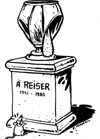 Το 1985, η Ars Longa κυκλοφορεί το άλμπουμ «Το μεγάλο ρεμάλι», του Γάλλου σκιτσογράφου Jean – Marc Reiser, γνωστού σε όλους απλά με το επώνυμο του. Ο αδικοχαμένος δημιουργός(πέθανε στα 42 του), άφησε πράγματι εποχή στο ίσως πιο αντιδραστικό Γαλλικό κόμικς περιοδικό, στο περίφημο Hara-Kiri. Για να καταλάβετε για τι μιλάμε, σας λέω χαρακτηριστικά ότι το περιοδικό διέκοψε την έκδοση του το 1970, μετά από απαίτηση του πρόεδρου της Γαλλικής δημοκρατίας Charles de Gaulle, αφού χαρακτηρίστικε σαν άσεμνο και προκλητικό! Οι διαστάσεις του χιούμορ φαίνεται, διασχίζονται με διαφορετικά βήματα από όλους εμάς, σε σχέση με αυτά των πολιτικών… Σήμερα, στην σειρά αυτή παρουσιάσεων που ονομάσαμε «Αποσπάσματα», θα σας δώσουμε έξη χαρακτηριστικές περιπτώσεις λογοκριμένου χιούμορ λοιπόν, μέσα από αυτό τη δουλειά του Reiser που αγαπήθηκε ιδιαίτερα στη χώρα μας, με κεντρικό χαρακτήρα έναν χύμα τύπο, φορώντας μόνον το σώβρακο και με όπλο την φιλοσοφία του που ξεκαρδίζει!