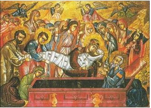 Εσένα, που το φως φοράς σαν ιμάτιο, όταν κατέβασε από τον Σταυρό ο Ιωσήφ μαζί με τον Νικόδημο και (σε) αντίκρισε νεκρό, γυμνό, άταφο, άρχισε ευσυμπάθητο θρήνο και έλεγε οδυρόμενος: “Αλίμονο γλυκύτατε Ιησού, που, πριν λίγο, επειδή (σε) είδε ο ήλιος να κρέμεσαι στον Σταυρό, τυλίχθηκε με σκοτάδι και η γη από τον φόβο εσείετο και σκιζόταν το καταπέτασμα του ναού. Αλλά, να, τώρα σε βλέπω για μένα να έχεις υποστεί με την θέλησή σου θάνατο. Πως θα σε κηδεύσω Θεέ μου; και πως θα σε τυλίξω με σεντόνια; Με ποια χέρια θα πιάσω το πάναγνό σου σώμα; και ποια τραγούδια θα ψάλλω στην κηδεία σου Οικτίρμονα; Δοξάζω τα πάθη σου, υμνολογώ και την ταφή σου μαζί με την ανάσταση και κραυγάζω: Κύριε δόξα σοι.”
