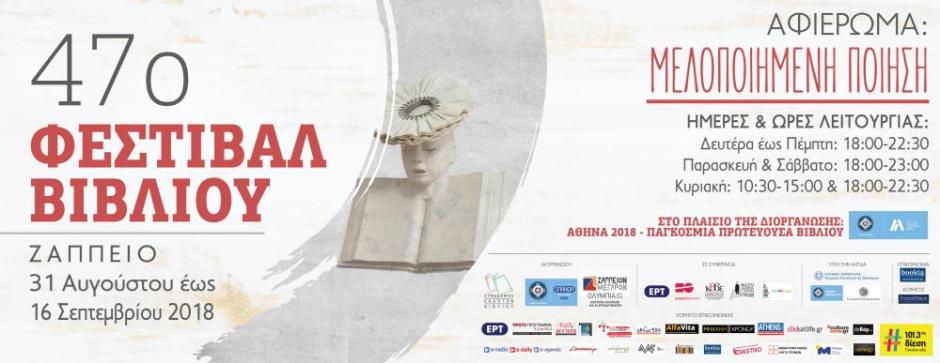 Ξεφυλλίζοντας το πρόγραμμα του 47ου Φεστιβάλ Βιβλίου –του θεσμού που διαχρονικά ενώνει αναγνώστες, συγγραφείς κι εκδότες και φέτος έχει επιστρέψει δυναμικά με αφιέρωμα στη μελοποιημένη ποίηση–, βρίσκουμε τιμητικές εκδηλώσεις, αφηγήσεις παραμυθιών, αφιερωματικές βραδιές, μουσικοποιητικές συναντήσεις και πόσα ακόμη. Την Παρασκευή 9 Σεπτεμβρίου ηθοποιοί, τραγουδιστές και συγγραφείς συμπράττουν σε μια αφιερωματική βραδιά στον Ευγένιο Σπαθάρη (σκηνή «Διονύσιος Σολωμός», 8 μ.μ.), ενώ το Σάββατο 10 Σεπτεμβρίου (8 μ.μ.), στον ίδιο χώρο, το Εθνικό Θέατρο φέρνει στο προσκήνιο τονΝίκο Καββαδία.