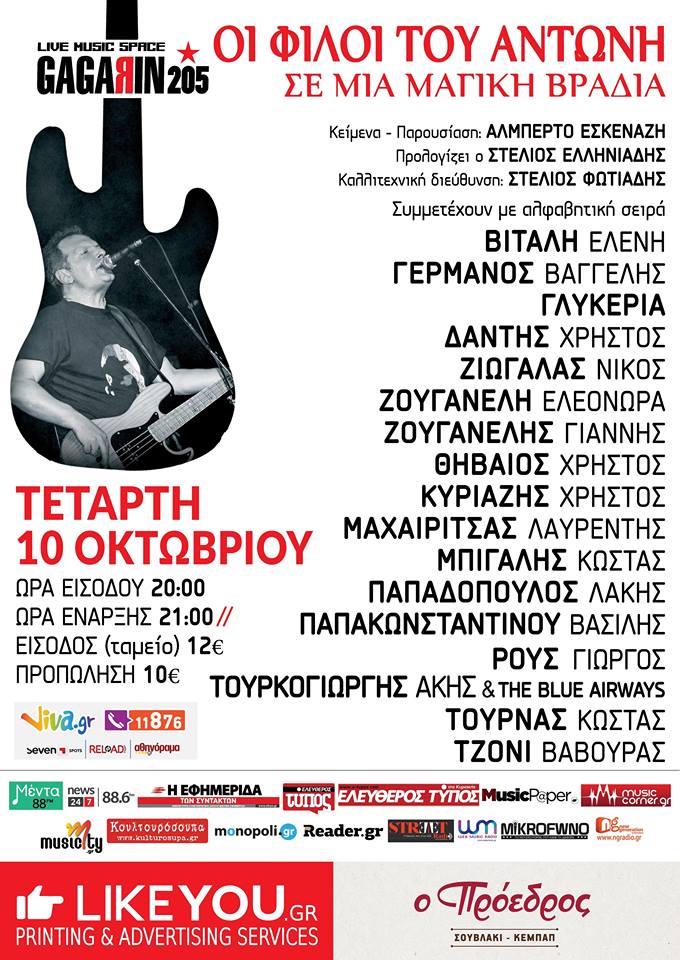 Συμμετέχουν με αλφαβητική σειρά: Βιτάλη Ελένη Γερμανός Βαγγέλης Γλυκερία Δάντης Χρήστος Ζιώγαλας Νίκος Ζουγανέλη Ελεονώρα Ζουγανέλης Γιάννης Θηβαίος Χρήστος Κυριαζής Χρήστος Μαχαιρίτσας Λαυρέντης Μπίγαλης Κώστας Παπαδόπουλος Λάκης Παπακωνσταντίνου Βασίλης Ρους Γιώργος Τουρκογιώργης Άκης & The Blue Airways Τουρνάς Κώστας Τζόνι Βαβούρας GAGARIN 205, Λιοσίων 205, Αθήνα. Ώρα έναρξης: 21:00, Ώρα εισόδου: 20:00 Τιμές Εισιτηρίων: Γενική είσοδος (ταμείο): 12 €. Προπώληση: 10 € Σημεία Προπώλησης: viva.gr, 11876, seven spots, reload, athinorama.gr…