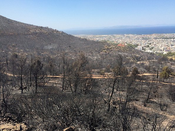Και εκεί που άλλοτε άκουγες τζιτζίκια να θρασομανούν, πουλιά να τιτιβίζουν, πεύκα να θροΐζουν, γέλια και συνομιλίες περιπατητών, τώρα το λόγο έχουνε μόνο τα αλυσοπρίονα. Ουρλιάζουν καταμεσήμερο, σαν Άρπυιες πεινασμένες καταβροχθίζοντας δέντρα νεκρά, αφού τα ρίξουν κάτω. Κι αυτά στην πτώση τους περήφανα δεν ζητιανεύουν οίκτο. Μόνο που πρέπει να συνηθίσουνε την οριζόντια θέση, αυτά που κατακόρυφα τον ουρανό κοιτούσαν. Μαύροι κορμοί οριζόντιοι δεμένοι μεταξύ τους για φράγμα χρησιμεύουνε να συγκρατούν το χώμα να μην το παίρνει η βροχή. Τόσο χαμηλά ξεπέσανε μα πρέπει να υπερασπιστούν τη γη που τα στήριζε τόσα χρόνια. Και το βουνό λες και το έχουνε ξυρίσει. Μια γύμνια, γκρίζα. Μοναδική παρηγοριά κάτι κυκλάμινα που ξεπετάγονται δειλά από της καμένης γης τα σπλάχνα.