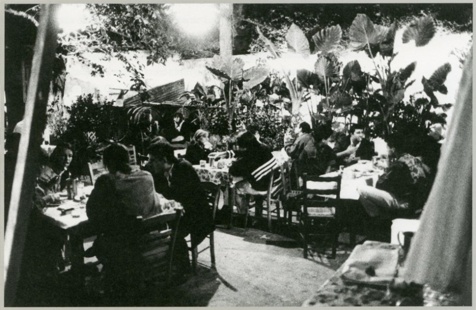 Μετά άρχιζε σιγά σιγά να έρχεται η γειτονιά. Η Τούλα με τον Γιώργο, ο Γιασάρ με την Αϊσέ, (Μουσουλμάνοι φίλοι, και συνάδελφος του μπαμπά) με τα δυο τους αγόρια, ο Γκάρμπις και η Αράζ Αρμένιοι με την κόρη τους που είχαν μαγαζί με είδη σπιτιού, ο Ένζο με την Λενιώ (αυτός Ιταλός ράφτης είχε ξεμείνει από τον πόλεμο για τα μάτια της Λενιώς), ο Ρέις με την Άφρα (Εβραίοι είχαν μπακάλικο στο λιμάνι) μ’ ένα μοναχογιό….κι έτσι γέμιζαν σιγά σιγά τα κόκκινα τραπεζάκια. Μοσχομύριζαν οι μεζέδες του Λευτέρη τα παιδιά τρέχαμε με τα κέρματα στο χέρι να βάζουμε δίσκους στο τζουκ μποξ οι γονείς μας να τραγουδούν, να μιλάνε,να γελάνε, να ρίχνουν και καμμία ζεϊμπεκιά…ένας κόσμος όμορφος διαφορετικός αγαπημένος κάτω από την ίδια πέργκολα μέσα σε μια μικρή αυλή κάπου μέσα στη πόλη, κάπου μέσα στον κόσμο….