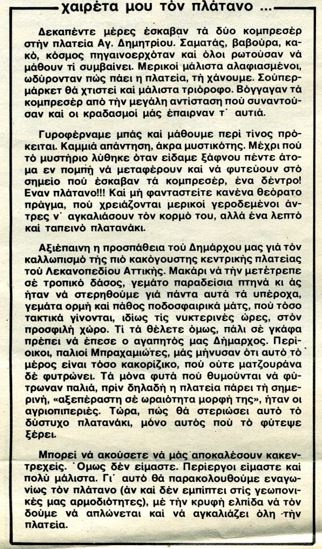 Πριν πολλά χρόνια και πιο συγκεκριμένα τον Φεβρουάριο του 1981 στο φύλλο 57 της τοπικής εφημερίδας Ελεύθερη Γνώμη στη θέση του κύριου άρθρου, δημοσιεύτηκε κείμενο – σχόλιο, που αφορούσε την “πλατεία” Αγ. Δημητρίου. Εκείνη την περίοδο βέβαια δεν είχε ακόμη γκρεμιστεί ο παλιός Ναός και ο τότε Δήμαρχος Γ. Μπουκογάννης, εν όψει εκλογών, (όπως συνεχίζεται αδιαλείπτως μέχρι και σήμερα από όλους τους Δημάρχους) προσπαθούσε να εξωραΐσει την πλατεία με κάποια έργα. Στην προσπάθεια του, φύτεψε και έναν Πλάτανο.