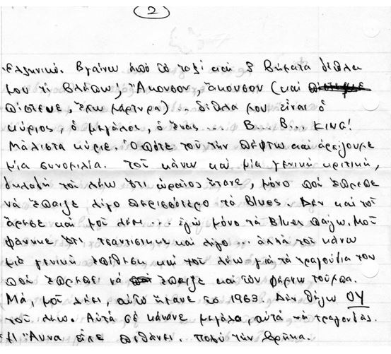 Η επικοινωνία, λιγοστή, άτακτη με κάποια γράμματα και κασέτες. Το καλοκαίρι του 1982 έρχεται στην Αθήνα απροειδοποίητα και εμφανίζεται ξαφνικά στα γραφεία του Κρόνου στο Μπραχάμι στην οδό Μύρωνος που μαζεύεται η παρέα. Αυτό ήταν! Ρεμούτσικο και χαβαλές όπως παλιά. Στο πρόγραμμα και η συναυλία του B.B King στο θέατρο του Λυκαβηττού μια μέρα πριν την επιστροφή του φίλου στην Αμερική. Ζεστή βραδιά, λίγος κόσμος και εισιτήριο στα φτηνά. Τηρώντας το έθιμο, με το σβήσιμο των προβολέων, μπούκα στο κάτω διάζωμα, λίγο πλάγια, αλλά πιο κοντά στον καλλιτέχνη.