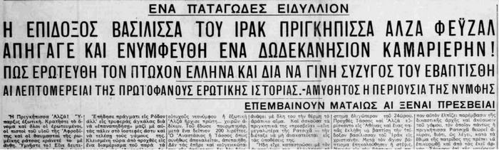 Η ιστορία του ειδυλλίου ,η εγκατάλειψη των ανακτόρων της Βαγδάτης για τη χάρη ενός μπατίρη Έλληνα ,δημοσιεύονται από την εφημερίδα Ακρόπολη . Ο δημοσιογράφος Μπαστιάς τους παίρνει συνέντευξη που κάνει πάταγο στην πρωτεύουσα και όχι μόνο!