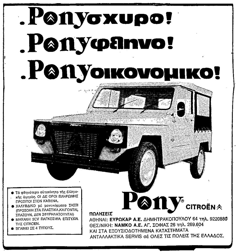 Το σχήμα του ήταν εντελώς τετράγωνο, μάλλον για ευκολία στην κατασκευή. Ήταν μία ατελείωτη στράτζα. Οι αναρτήσεις του Pony ήταν αυτές του 2CV. Μπροστά η μάσκα παρέπεμπε στη Citroen με παραπλήσιο σήμα αλλά και την υποδοχή για τη μανιβέλα. Οι ζάντες ήταν οι γνωστές με τα τρία μπουλόνια. Τα στενά λάστιχα θύμιζαν περισσότερο ποδήλατο παρά αυτοκίνητο. Το εσωτερικό ήταν σπαρτιάτικο. Ο λεβιές των ταχυτήτων ήταν ίδιος με του 2CV, τοποθετημένος επάνω στο ταμπλό. Το φλας λειτουργούσε χωρίς επαναφορά αλλά έκανε τόσο θόρυβο το ρελέ, που ήταν αδύνατον να το ξεχάσεις. Τα καθίσματα επίσης υποτυπώδη. Συνήθως καθόμασταν τρεις μπροστά και τρεις πίσω. Το χρώμα του ήταν μαύρο, αλλά από τη σκόνη είχε γίνει άσπρο. Μια μέρα ο Δημήτρης του έπλυνε και νομίζαμε ότι το είχε βάψει!