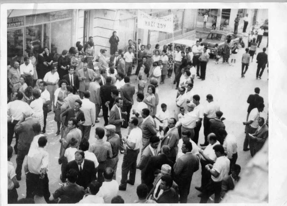 Ένα πανώ που κρατάνε δύο οπαδοί και απ΄όσο μπορούμε να διακρίνουμε γράφει «Η ΣΥΝΟΙΚΙΑ …ΜΑΖΙ ΣΟΥ». Ο κόσμος δείχνει ήρεμος και περιμένει ν’ αρχίσει η ομιλία, πολλοί άνδρες φορούν γραβάτες όπως συνηθίζονταν τότε και είναι σαφώς περισσότεροι απ τις γυναίκες.