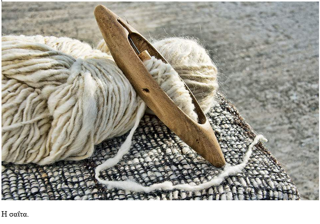 Δες τώρα τη σαΐτα. Είναι ειδικό ξύλο χωρίς ακμές και καμένο για να γλιστράει στο νήμα. Το νήμα της σαΐτας είναι στο μασούρι της. Μόλις τελειώσει θα φτιάξουμε άλλο με την ανέμη. Χρειαζόμαστε αρκετό από αυτό το νήμα. Τη χρησιμοποιούμε σε καρέ σχέδια. Αν θέλουμε σχέδιο με ζώα ή φυτά τότε αλλάζει το πράγμα. Εκεί θέλει βελόνα και γυαλιά πρεσβυωπίας. Ξεκινάμε! Κάτσε δίπλα μου!