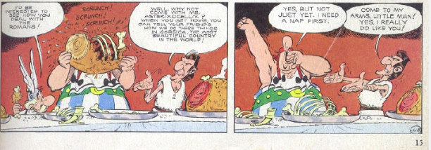 Στο τέλος θα γίνει το συμπόσιο που έχει σχεδόν τα ίδια σκηνικά και γευστικά χαρακτηριστικά με το χωριό των Γαλατών. Είναι χαρακτηριστικό των ανυπότακτων. Η μόνη διαφορά είναι ότι απουσιάζουν οι γυναίκες ως καθήμενες στο πλούσιο γεύμα. Εμφανίζονται όμως ως υπηρέτριες των πολεμιστών.
