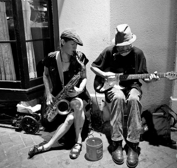 με φαρδύ καπέλο και παλιά ρούχα της μουσικής
