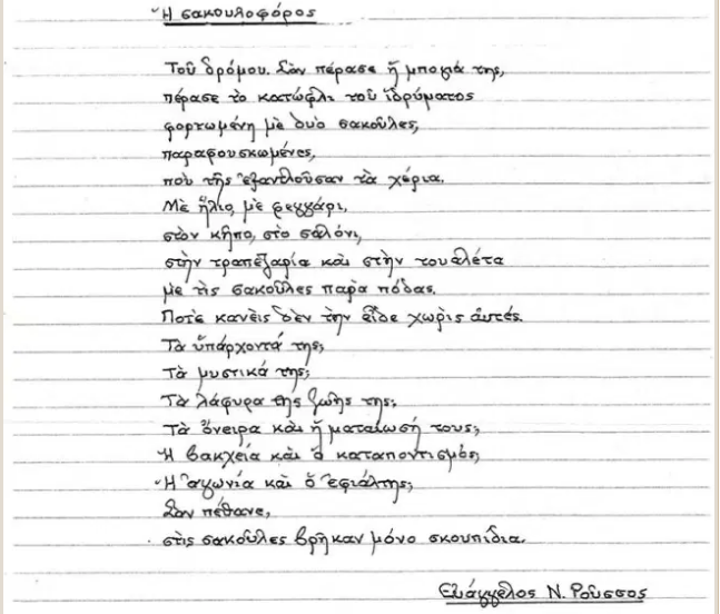 Ιστορίες για την ποίηση (32)…Ευάγγελος Ρούσσος Posted στο 16/11/2020 από chrispipin in On The Road // 0 Comments Ευάγγελου Ρούσσου…η σακουλοφόρος Πηγή: https://periodikotrypa.wordpress.com/ Κοινοποιήστε:Tweet Στείλε ένα σύνδεσμο σε έναν φίλο(Ανοίγει σε νέο παράθυρο) Email Μου αρέσει! Φόρτωση... Σχετικά ποίησηΕυάγγελος Ρούσσος