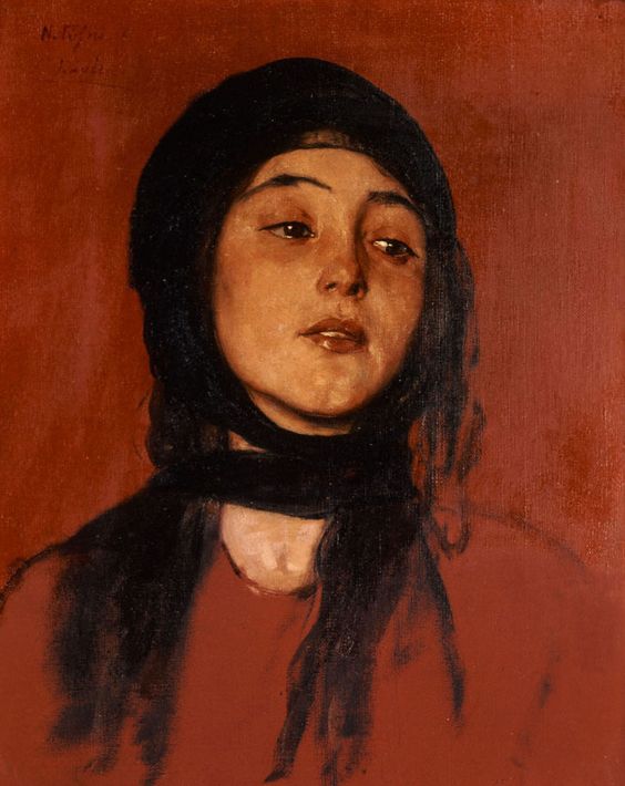 Πάνω σε ένα κόκκινο κεραμιδί βάθος προβάλει δεμένο με μαύρο μαντήλι το λυπημένο πρόσωπο της κόρης. Τα μάτια της βουρκωμένα συγκρατούν μόλις τα δάκρυα, ενώ από τη βαθιά συγκίνηση φαίνονται να ανοίγουν με πόνο τα σαρκώδη χείλη. Το πρόσωπό της φρέσκο, νεανικό, θα αποτελέσει το γνωστό τύπο της ελληνίδας κόρης και μάνας που θα συναντάται συχνά στις ιστορικές του ηθογραφίες.