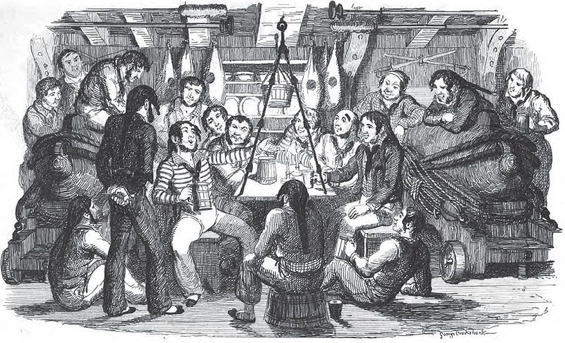 Καὶ μὲ τὸ λόγο φάνηκε μαῦρο κορμὶ στὴν ἀνοιχτὴ θυρίδα, κύλησε ἀπὸ τὴ σκάλα κάτω ὁ Κώστας ὁ θερμαστής, βαρυτυλιγμένος στὴν πατατούκα του. Ἔκανε κρύο δυνατό. Βοριὰς ἐξύριζε τὰ πέλαγα, πάγωνε τ᾿ ἀκρογιάλια, κρουστάλλιαζε τὰ στοιβαγμένα χιόνια στὰ βουνά. Καὶ τὸ πλήρωμα, ναῦτες καὶ θερμαστές, συναγμένοι ὁλόγυρα στὴ θερμάστρα, φρόντιζαν νὰ ζεσταθοῦν μὲ τὴ φασκομηλιὰ καὶ τὸ ψωμοτύρι. Ὁ λύχνος, καρφωμένος στὴ μέση ἑνὸς στύλου, φώτιζε καὶ κάπνιζε μαζὶ τὰ περίγυρα σωθέματα. Διπλὰ-τριπλὰ τὰ κρεβάτια κολλημένα στὰ πλευρά, μὲ τὰ μαῦρα τους στρωσίδια, θύμιζαν νεκροθῆκες στ᾿ ἀνήλιαστα βάθη τῆς γῆς ταιριασμένες. Κοντὰ ἡ καμαρούλα τοῦ ναύκληρου, ἀνοιχτόπορτη, ἔδειχνε ἄλλο κρεβάτι στρωμένο, δυό-τρεῖς φωτογραφίες παλιές, μιὰ χρωμολιθογραφία χανούμισσας, χρυσοφορεμένης καὶ ξαπλωμένης σὲ πουπουλένια προσκέφαλα. Καὶ ὁλοῦθε κρεμασμένα τὰ ροῦχα, στὸ λάδι καὶ στὸ κάρβουνο βουτημένα. Οἱ μουσαμάδες ξεσχισμένοι καὶ μυριομπαλωμένοι. Τὰ χοντρὰ ποδήματα καὶ τὰ κασκέτα καὶ οἱ χρωματιστοὶ σκοῦφοι ἔδειχναν τὸ χώρισμα καλογερικὸ κελλί. Ἀλλὰ τὸ φλίφλισμα τοῦ νεροῦ ποὺ ἀκουόταν στὰ πλευρά, ἡ μυρωδιὰ τοῦ κατραμιοῦ καὶ τὰ ψημένα πρόσωπα τῶν ἀνθρώπων ἔδειχναν πὼς ἡ ζωὴ ἐδῶ ἀγωνίζεται τὸν τελευταῖο ἀγώνα της. Γιὰ τοῦτο καὶ κανένας δὲν πρόσεξε τώρα στὸ ἀστεῖο κατρακύλημα τοῦ θερμαστῆ.
