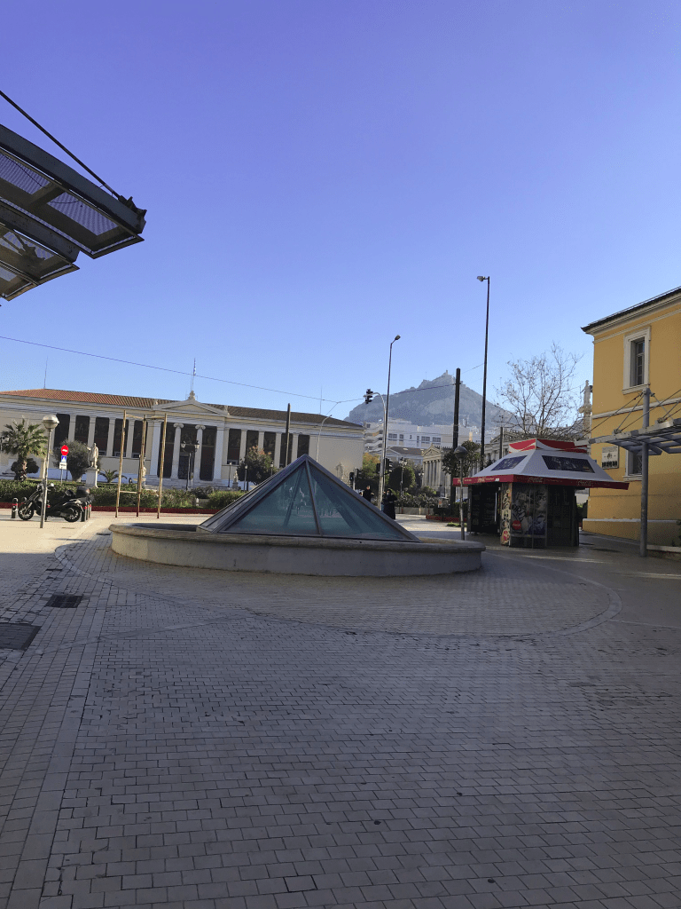 Συνεχίζω προς την είσοδο του κτηρίου μου. Μετανιώνω όμως, γιατί ο ουρανός είναι καθαρός. Τίποτα δεν δείχνει ότι χθες έριχνε χιόνι. Μόνο κάποιες σκιερές γωνιές διατηρούν το λιγοστό παγωμένο χιόνι. Γυρίζω 180 μοίρες και βλέπω τον Λυκαβηττό. Μπροστά μου ένα κατασκεύασμα κάτι σαν την πυραμίδα του Λούβρου, πιο φτηνό, λιγότερο μεγαλόπρεπο αλλά κάτι είναι κι αυτό. Σπάει τουλάχιστον το τσιμεντένιο χρώμα της πλατείας. Πιο πίσω, τα Προπύλαια με λίγο καλό πράσινο και στο βάθος ο περίφημος λόφος της Αθήνας. Είμαι σχεδόν μόνος στην πλατεία και δεν δυσκολεύομαι να βγάλω μία φωτογραφία χωρίς ανθρώπους. Εγκαταλείπω με θλίψη το μοναδικό γαλάζιο χρώμα του Αττικού ουρανού, που ο βάνδαλος δεν μπορεί να καταστρέψει, σβήνω το τσιγάρο στο τασάκι της εισόδου και πάω στον 1ο όροφο για την απαραίτητη θερμομέτρηση…Τώρα δουλειά…