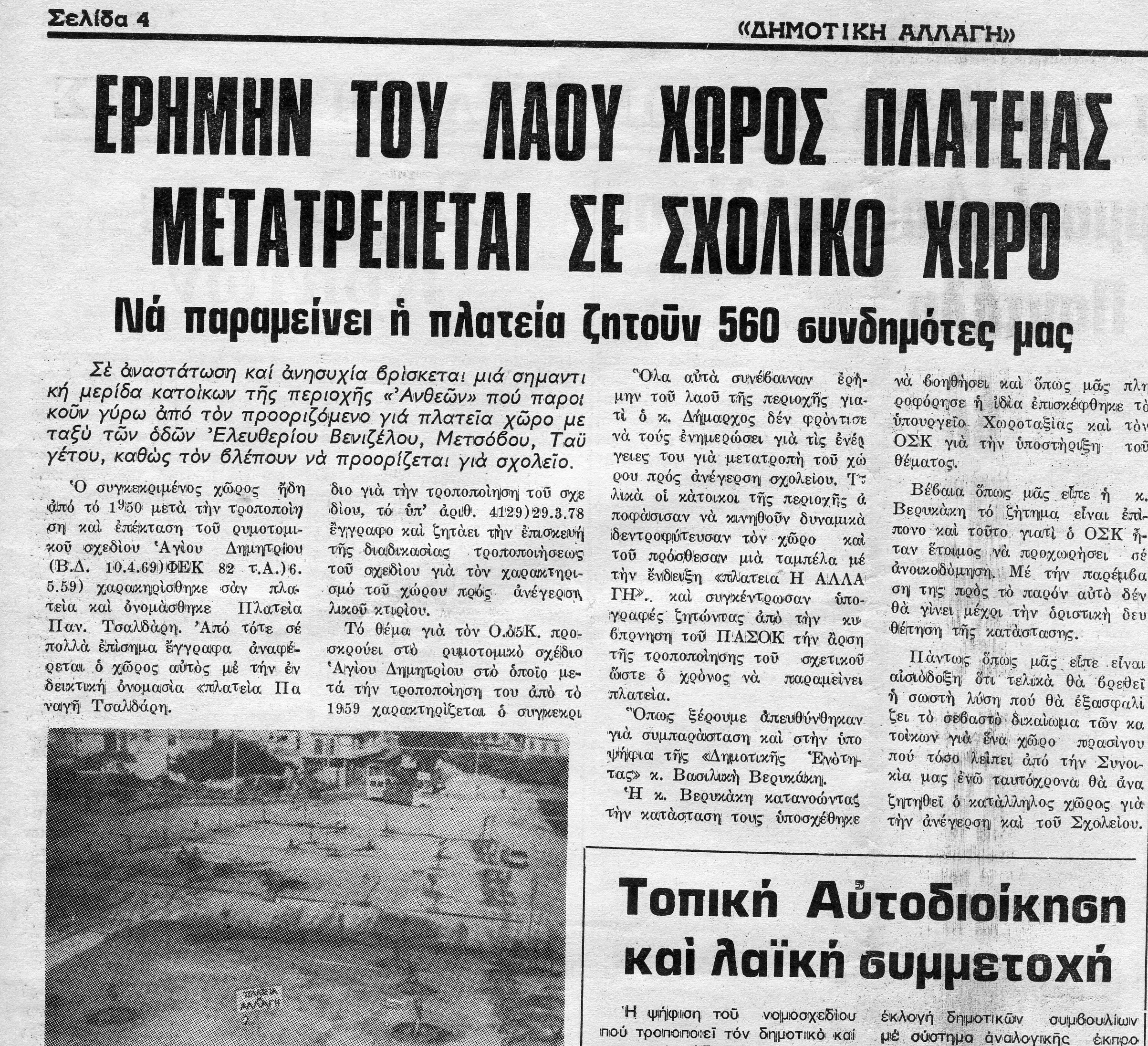 ΤΑ ΔΗΜΟΤΙΚΑ ΜΑΣ ΝΕΑ…εφημερίδα που εξέδωσε για ένα σχετικά σύντομο διάστημα, ο Χρίστος Τσίλης που πέραν των τοπικών ειδήσεων έδινε βάρος στην αθλητική επικαιρότητα, κυρίως γύρω από την ποδοσφαιρική ομάδα της συνοικίας την Μπάρτσα (ΠΑΟ Αγ. Δημητρίου). Ας σημειώσουμε ότι τις αθλητικές ειδήσεις επιμελείτο ο δημότης και συντάκτης της ημερήσιας πανελλήνιας Αθλητικής Ηχούς, Σάκης Τσακασιάνος (Σακ Τσακ).