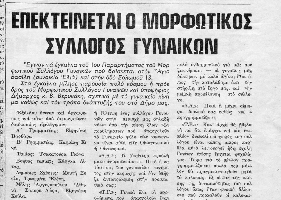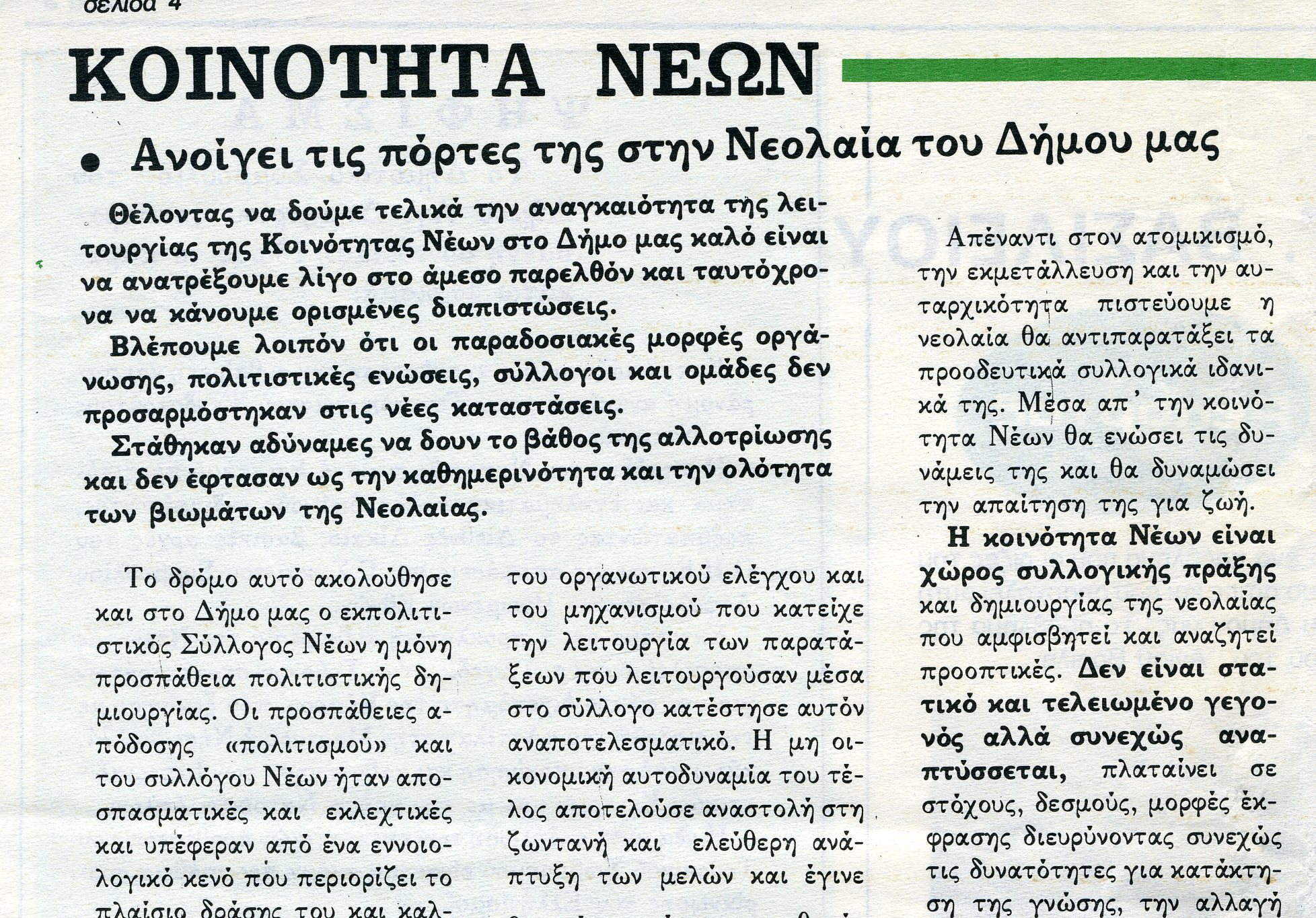 ΚΟΙΝΩΝΙΑ – ΠΟΛΙΤΙΣΜΟΣ: Ακολουθώντας τις επιταγές της τότε κυβέρνησης του ΠΑΣΟΚ γίνονται σλόγκαν και πομπώδεις πολιτικές άνευ περιεχομένου, η «λαϊκή συμμετοχή» η»λαϊκή επιμόρφωση» κλπ, που έμειναν φυσικά ως ωραία ανάμνηση και η επιτομή του «άλλα λόγια ν’ αγαπιόμαστε»