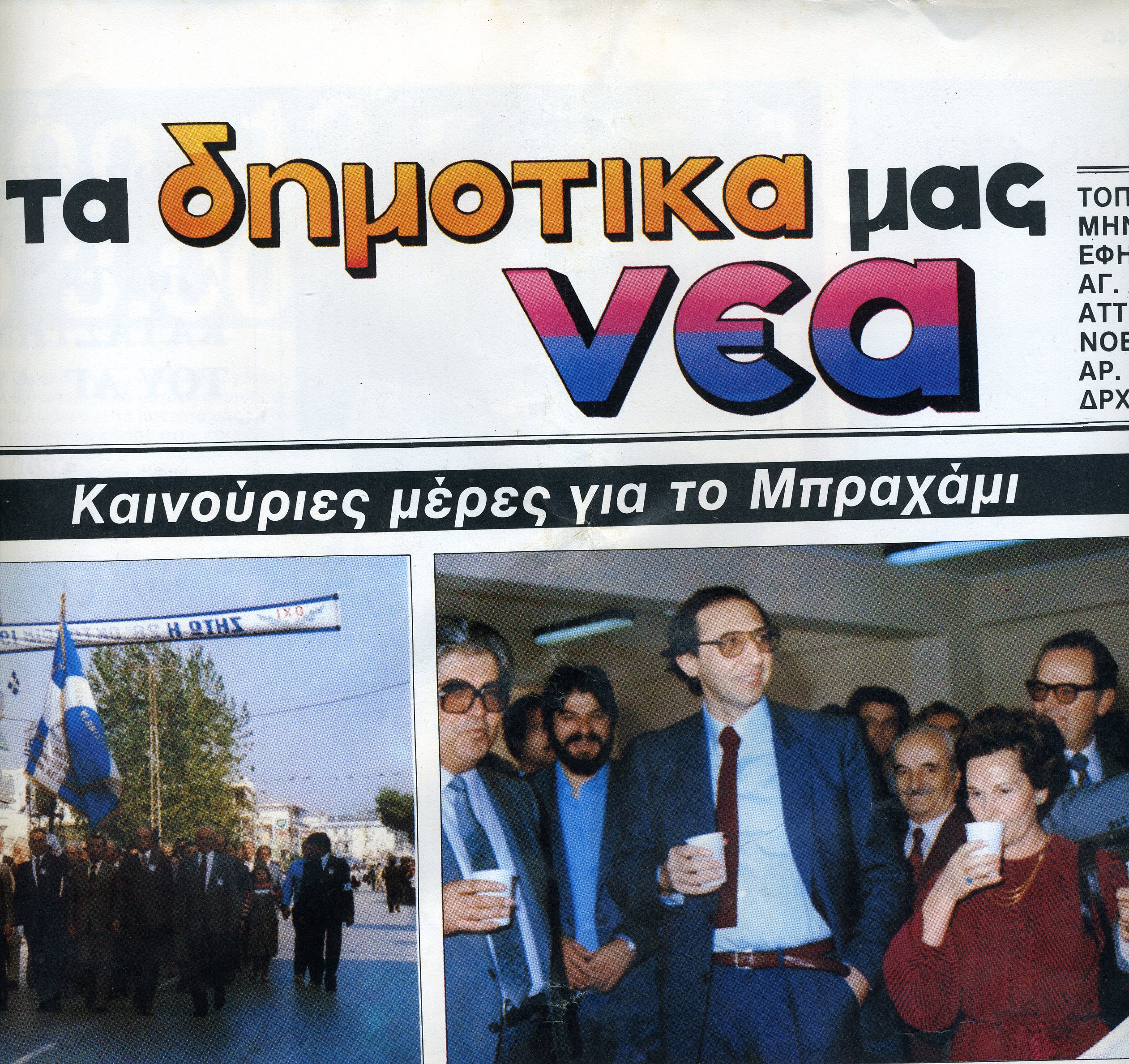 Ανασύραμε από το αρχείο μας μερικές τοπικές εφημερίδες που εκδίδονταν στο Δήμο, και που παρουσιάζουν ένα ιδιαίτερο ενδιαφέρον καθώς καθρεφτίζουν το Μπραχάμι την εποχή των αρχών της δεκαετίας του 80, μια εποχή έντονων πολιτικών αντιπαραθέσεων, κοινωνικών μεταβολών, καθώς και αμέτρητων άλυτων προβλημάτων που προτάσσονταν σαν αιχμή του δόρατος από τις τοπικές Δημοτικές παρατάξεις. Η πικρή γεύση που μένει από την ανάγνωση τους είναι ότι τα βήματα που έχουν γίνει από τότε είναι πολύ λίγα σε σχέση με τα κορυφαία προβλήματα που εξακολουθούν να παραμένουν ακλόνητα στο πέρασμα του χρόνου (Νεκροταφεία, Ασύρματος, Ρέματα, Ελεύθεροι χώροι…) ενώ η κυριαρχεί η βεβαιότητα ότι τίποτα δεν θ’ αλλάξει (τουλάχιστον επί Δημαρχίας Ανδρούτσου που κυκλοφορεί ως φάντασμα υποδυόμενη τη Δήμαρχο, που βρίσκεται ανάλογα με την περίσταση και σε κάθε ευκαιρία, δίπλα στη χαρά και στη λύπη κάθε Δημότη είτε ευχόμενη είτε συλλυπούμενη).