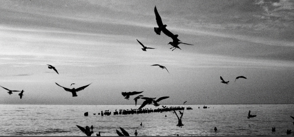 Ο μάγειρας, όρθιος έξω από την κουζίνα, είχε σκεπάσει τ’ αφτιά του με τις παλάμες για να μην ακούει τα σκουξίματα. Ξαφνικά μπήκε στην κουζίνα κι επέστρεψε μ’ ένα δοχείο με υπολείμματα τροφών, τα έριξε στη θάλασσα για να καλοπιάσει τα πουλιά.