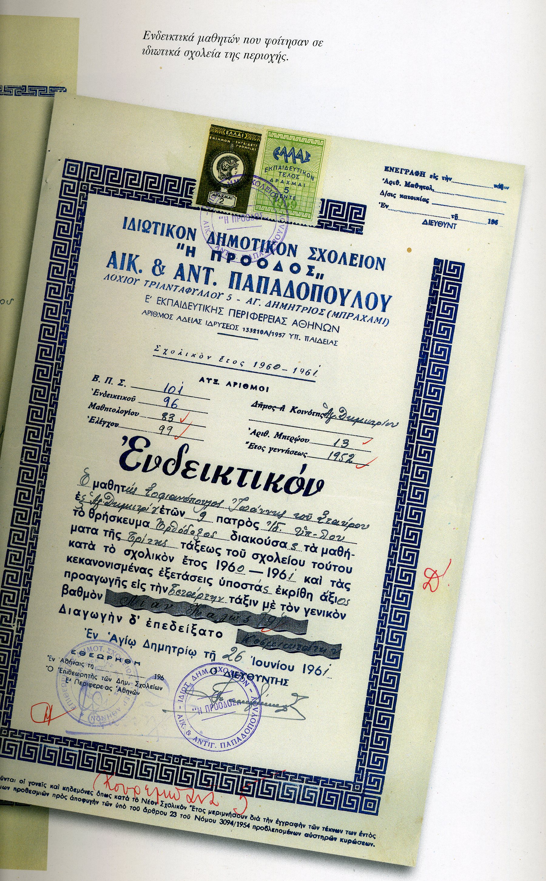 Επιβεβαιώνεται ότι το σχολείο με τον διακριτικό τίτλο ΠΡΟΟΔΟΣ της Αικ. & Αντ. Παπαδόπουλου βρισκόταν στην οδό Λοχία Τριανταφύλλου 5, μάλλον πρώην Κουρεμπανά, όπως δείχνει η κόκκινη σημείωση στο τέλος του ενδεικτικού χρονολογίας 26/6/61 (σελ. 104). Σε άλλη σελίδα (98) στην αναμνηστική φωτογραφία σχολικού έτους 1967-68 αναφέρεται στη λεζάντα ως Β’ Δημοτικό σχολείο (Παπαδόπουλου). Δεν διαθέτουμε όμως στοιχεία, αν αργότερα και για κάποιο διάστημα λειτούργησε και ως Γυμνάσιο.