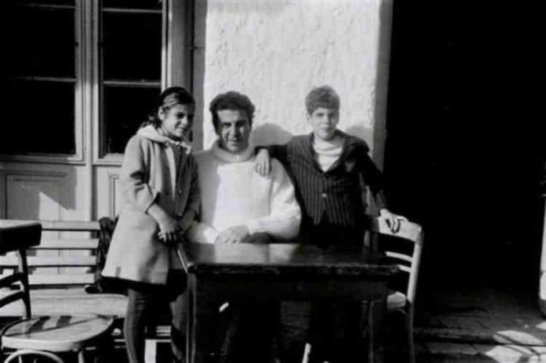Ζάτουνα 1968, Μίκης με τα παιδιά του Μαργαρίτα και Γιώργο, στην πλατεία, μπροστά στο καφενείο του Τέρρη http://www.mikistheodorakis.gr/el/multimedia/photos/all/?st=100