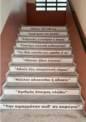 Τώρα εξηγούνται όλα σκέφτηκα. Στο μέτωπο λοιπόν του Αριστοκλή επειδή ήταν ευρύ, όταν μεγάλωσε βρήκαν καταφύγιο πολλές και υψηλές Ιδέες. Κάποιες από αυτές είναι γραμμένες στις μετώπες των σκαλοπατιών που οδηγούν στον πρώτο όροφο του κτηρίου. Αυτά τα αποφθέγματα δίνουν στην κλίμακα ζωή.