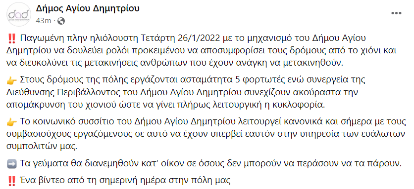 «Παγωμένη πλην ηλιόλουστη» η σημερινή μέρα σύμφωνα με τον συντάκτη. Είναι μία καλή αρχή για έκθεση της Α’ Δημοτικού. Μάλλον ήθελε να πει «ηλιόλουστη πλην παγωμένη», που ερμηνεύεται αλλιώς. Και μέσα στην «παιδική αφέλεια», τσουκ η φράση: «με το μηχανισμό του Δήμου Αγίου Δημητρίου να δουλεύει ρολόι». Όλη η πρόταση είναι λάθος και ο Δήμος Μπραχαμίου φυσικά και δεν λειτουργεί σαν ρολόι. Επίσης, απουσιάζουν κόμματα, ενώ η «αποσυμφόρηση των δρόμων» από το χιόνι, είναι όλα τα λεφτά. Οι δρόμοι αποσυμφορίζονται από τα οχήματα. Το χιόνι καθαρίζεται δεν αποσυμφορίζεται. Η συμφόρηση σχετίζεται με κινητά πράγματα. Το χιόνι στέκεται εκεί ακίνητο και δεν έχει υποστεί μποτιλιάρισμα. Δεν θέλει να πάει αλλού. Αν πήγαινε αλλού θα ήταν χιονοστιβάδα. Ακολουθεί το επόμενο τούβλο: «να διευκολύνει τις μετακινήσεις ανθρώπων που έχουν ανάγκη να μετακινηθούν». Μήπως να αποκαταστήσει την κυκλοφορία των ανθρώπων; Φαίνεται ότι λέξη «διευκόλυνση» είναι θέμα νοοτροπίας. Άσε που η διευκόλυνση μετακίνησης εκείνου που θέλει να μετακινηθεί είναι πλεονασμός. Εκτός κι αν διευκολύνουμε τη μετακίνηση σε αυτούς που έχουν ανάγκη για κάτι άλλο.
