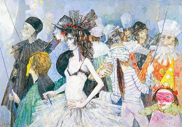 Κι όμως η σάλα, μ’ όλη της την κίνηση, απ’ τη στιγμή που είχαν μπει, κάπως περίεργα, τα σιωπηλά εκείνα ντόμινα, είχε πάρει μια καινούριαν όψη, χωρίς κανένας να μπορεί να πει γιατί: Τα φώτα έλαμπαν πολύ πιο ζωηρά, η ατμοσφαίρα γιόμισεν αρώματα. Τα γέλια κι οι κουβέντες των ανθρώπων, είχαν πάρει κάποιον τόνο χαμηλότερο, σα μια συνεσταλμένην επιφύλαξη — κι ένας τρελός πιερότος, σκανταλιάρης, πιο τολμηρός από τις άλλες μάσκες, που θέλησε με τρόπο να πειράξει το ψηλότερο μεσαίο μαύρο ντόμινο και να του ρίξει χαρτοπόλεμο στο στόμα, σταμάτησε λιγάκι σαστισμένος…