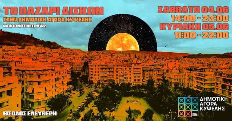 Έπειτα από την τεράστια επιτυχία που σημείωσε το χριστουγεννιάτικο ΠΑΖΑΡΙ ΔΙΣΚΩΝ στον υπέροχο χώρο της Δημοτικής Αγοράς Κυψέλης, αλλά και έπειτα από απαίτηση πολλών ‘‘’εραστών’’ του βινυλίου, το πιο παλιό εν ενεργεία ΠΑΖΑΡΙ ΔΙΣΚΩΝ της πόλης, επιστρέφει, το πρώτο Σαββατοκύριακο του Ιουνίου για να προσφέρει ένα μοναδικό καλοκαιρινό διήμερο στους λάτρεις των βινυλίων!