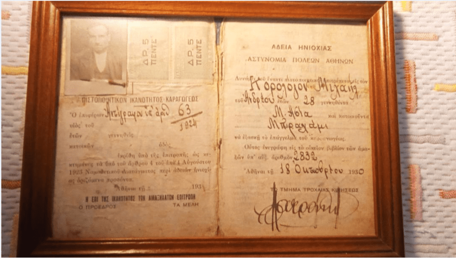Εκτός από αυτή που δεν βρίσκεται στα χέρια μου, έχω την τιμή να έχω σε κορνίζα την ΑΔΕΙΑ ΗΝΙΟΧΙΑΣ, που εκδόθηκε από την Αστυνομία Πόλεων Αθηνών και το τμήμα τροχαίας κινήσεως στις 18 Οκτωβρίου 1930. Δεν ξέρω που την είχα βρει, την φύλαξα και κάποια στιγμή την κορνιζάρισα. Τη θεώρησα ως δημόσιο έγγραφο, ένα είδος ιστορικού τεκμηρίου.
