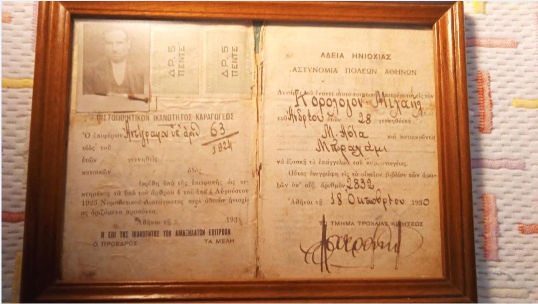 Εκτός από αυτή που δεν βρίσκεται στα χέρια μου, έχω την τιμή να έχω σε κορνίζα την ΑΔΕΙΑ ΗΝΙΟΧΙΑΣ, που εκδόθηκε από την Αστυνομία Πόλεων Αθηνών και το τμήμα τροχαίας κινήσεως στις 18 Οκτωβρίου 1930. Δεν ξέρω που την είχα βρει, την φύλαξα και κάποια στιγμή την κορνιζάρισα. Τη θεώρησα ως δημόσιο έγγραφο, ένα είδος ιστορικού τεκμηρίου.