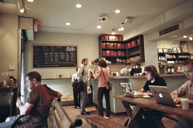 «Γιὰ ὄνομα τοῦ θεοῦ, κοπέλα μου, ὄχι μέσα στὰ Σταρμπακς, μὲ γνωρίζουν ἐδῶ», εἶπε καὶ χαμήλωσε τὸ καπέλο του ντροπιασμένος.