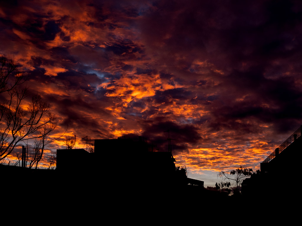 πάνω απ’ τους σκοτεινούς όγκους των πολυκατοικιών.