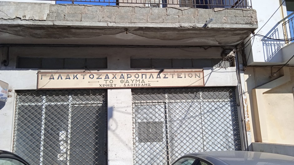 Εγκαταλελειμμένο τώρα το γαλακτοζαχαροπλαστείο με κατεβασμένα ρολά και πεσμένους σοβάδες, μόνο η μερακλίδικη ταμπέλα του προδίδει δόξες περασμένων εποχών. Μπορεί να έβγαζε και τραπεζάκια στο ευρύχωρο πεζοδρόμιο, εδώ που τώρα παρκάρουνε αμάξια. Φαντάζομαι τον ιδιοκτήτη του Χρήστο Λαοπόδη με άσπρη καθαρή ποδιά να σερβίρει τους εκλεκτούς πελάτες του με τα ολόφρεσκα γλυκά του, όλο χαρά. Και αυτοί να τα απολαμβάνουνε, λες και βρίσκονται στην παραλία της Σμύρνης αγναντεύοντας μπροστά τους το Αιγαίο και να κουβεντιάζουν για το θαύμα του Μικρασιατικού Ελληνισμού…