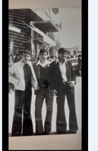 1974. Έχουμε και λέμε. Τρείς πιτσιρικάδες με τα «καλά» τους και παντελόνια καμπάνες, σημαίες, κόσμος και γιορταστική ατμόσφαιρα. Σημερινοί αξιοσέβαστοι πολίτες, ασχολούμενοι ενεργά με το Δήμο και όχι μόνο. Σοφιανόπουλος Σούλης, Φαναράς Στράτος και Παυλάτος Γεώργιος. Αρχείο Γ. Παυλάτου.