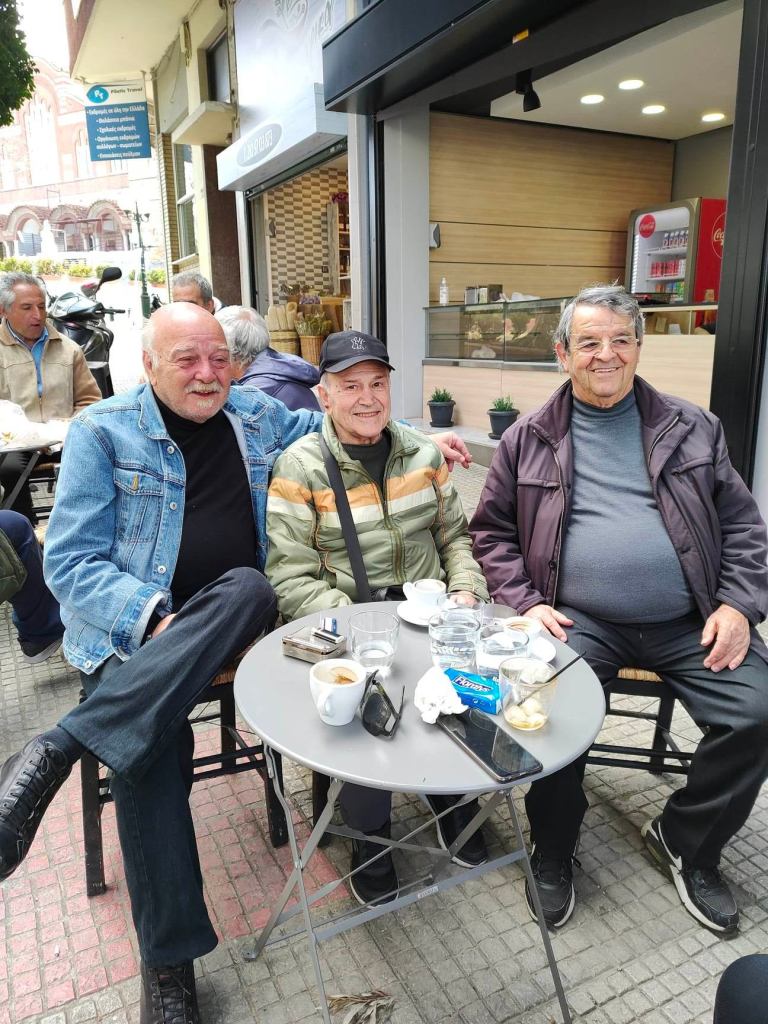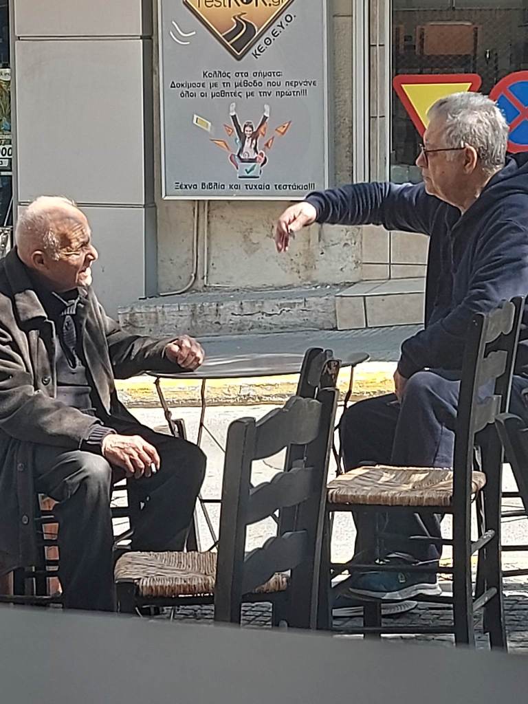 2023. Λίγα μέτρα πιο κάτω, στου Φώτη, Δύο επιφανείς συμπολίτες μας. Ο Αρτίστας του μπουζουκιού Γιάννης Μωραίτης, συνομιλεί χαλαρά τον Πρύτανη , ερευνητή συλλέκτη του λαϊκορεμπέτικου,και όχι μόνο, τραγουδιού, φίλου και συνεργάτη του ραδιοφώνου των imaginistes, Γιώργο Λιακόπουλο.