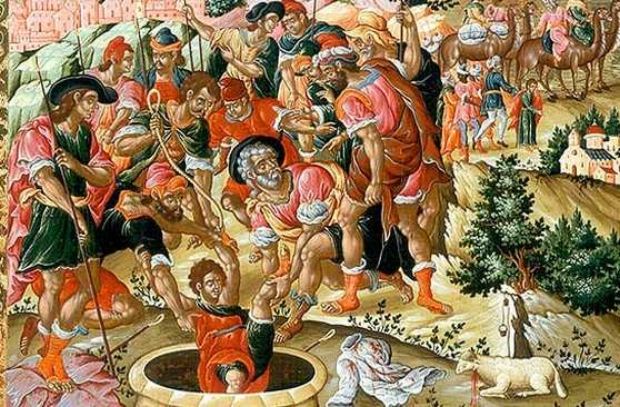 Εικόνα με παράσταση από την ιστορία του Ιωσήφ, 1677-82. Παριστάνεται το επεισόδιο που οι αδελφοί του Ιωσήφ τον ρίχνουν στο λάκκο, ενώ στο βάθος δεξιά εικονίζονται οι Ισμαηλίτες έμποροι στους οποίους πούλησαν τον Ιωσήφ. Η εικόνα είναι έργο του κρητικού αγιογράφου Θεόδωρου Πουλάκη (1620-1692), που γεννήθηκε στα Χανιά και εργάστηκε στην Κρήτη, στη Βενετία και στην Κέρκυρα.