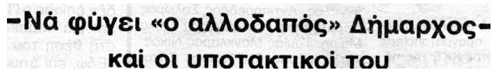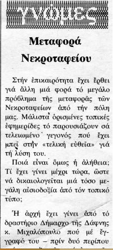 Τα κείμενα και οι φωτογραφίες αφορούν τίτλο της εφημερίδας με την απαίτηση να φύγει ο τότε Δήμαρχος Γ. Μπουκογιάννης χαρακτηρίζοντας τον απαξιωτικά “αλλοδαπό”, μια φωτογραφία της Ιστορικής ΕΛΚΑ …για να μας υπενθυμίζει ότι η μανία της κατεδάφισης της ιστορικής μνήμης της πόλης με την καταστροφή μεγάλης αξίας κτιρίων της περιοχής μας (Σκαβάντζος ) , δεν είναι προνόμιο της σημερινής Δημ. Αρχής της κ. Ανδρούτσου, αλλά και προγενεστέρων, καθώς και ένα εξαιρετικά επίκαιρο σχόλιο για το Νεκροταφείο και την απομάκρυνσή του, μέγα θέμα της περιοχής μαζί με τον Ασύρματο και τη ΔΕΗ, που παραμένουν σταθερά μετά από τόσα χρόνια, στάσιμα και χωρίς ελπίδα επίλυσης τους. Θα λέγαμε ότι η αναπαραγωγή αυτών των ντοκουμέντων μας οδηγεί στο πένθιμο συμπέρασμα ότι στο Δήμο μας, “όλα τριγύρω αλλάζουνε κι’ όλα τα ίδια μένουν”.