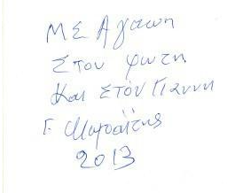 Να λοιπόν που όλα μπορούν να συμβούν και η ταπεινή συνοικία μας ν’ αποκτήσει διεθνή αναγνώριση μέσω του συμπολίτη μας. Χαρείτε την, με την ιδιόχειρη αφιέρωση του Γιάννη.