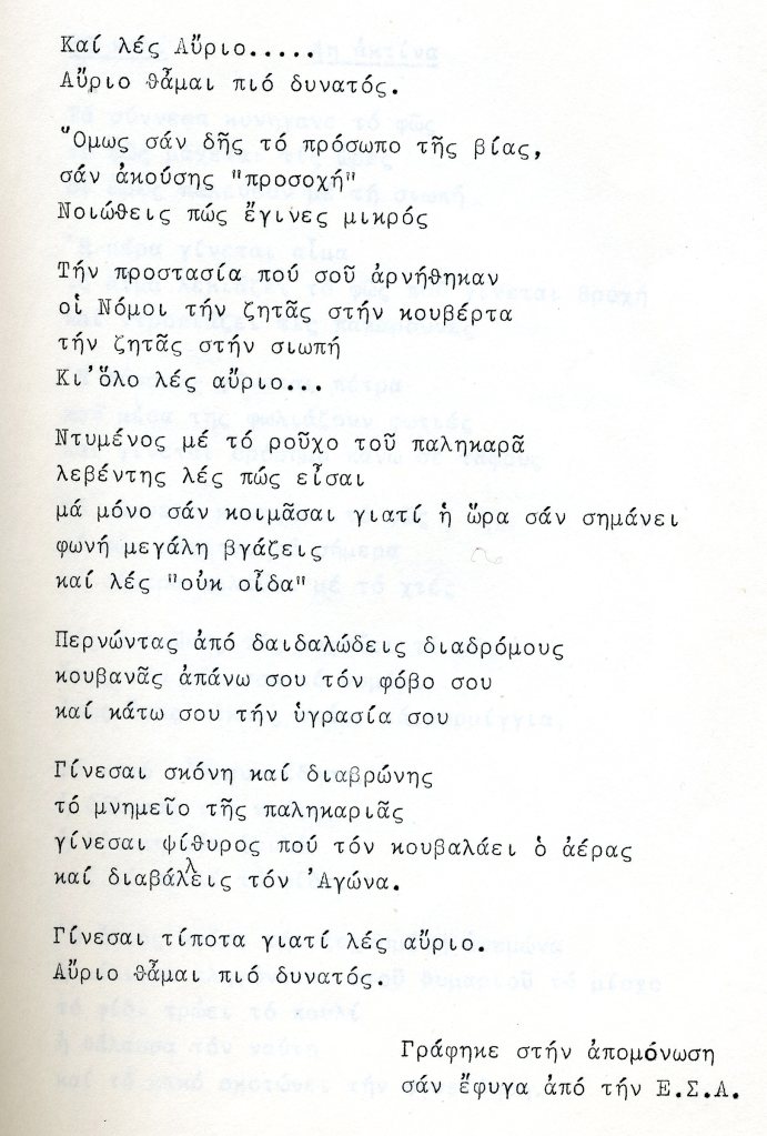 Το παρακάτω ποίημα προέρχεται από χειροποίητη» ποιητική του συλλογή ΚΑΤΑΓΡΑΦΕΣ όπως και το χρονολόγιο και η ιδιόχειρη αφιέρωση στον παιδικό φίλο Βαγγέλη Γκουγκουλή που ευγενικά μας τα παραχώρησε.