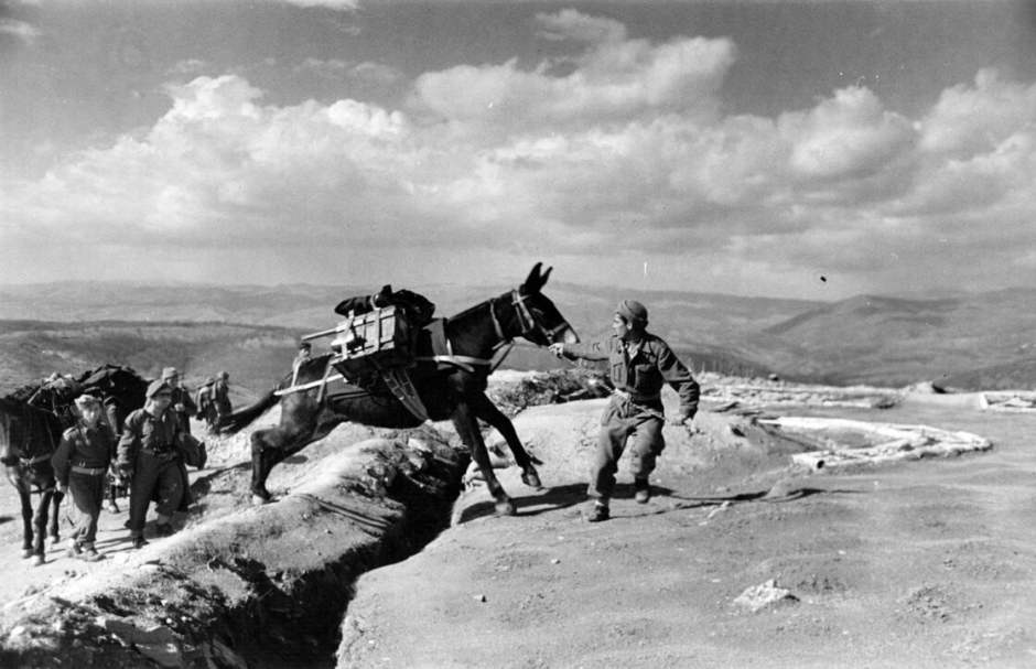 greek civil war – φωτό https://www.lifo.gr/culture/arxaiologia/27-aspromayres-fotografies-apo-ton-elliniko-emfylio – Ένα μουλάρι μεταφέρει πυρομαχικά στο χωρίο Παπάδες της Εύβοιας (1948)