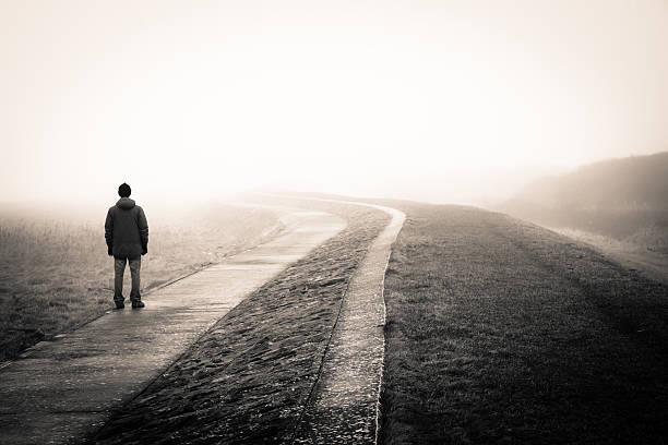 lonely man loosing the way on a foggy day….https://www.istockphoto.com/search/2/image-film?phrase=black+and+white+road