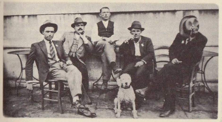 Φωτό Lifo – Πειραιάς, γύρω στο 1935. Αριστερά ο στιχουργός Νίκος Μάθεσης «Τρελλάκιας». Αυτός με το σκυλί είναι ο Σωτήρης Γαβαλάς (δεύτερος από δεξιά). Ο πρώτος από δεξιά, που κρύβει το πρόσωπό του με το καπέλο του, ή είναι καταζητούμενος ή δεν του αρέσουν οι φωτογραφίες.