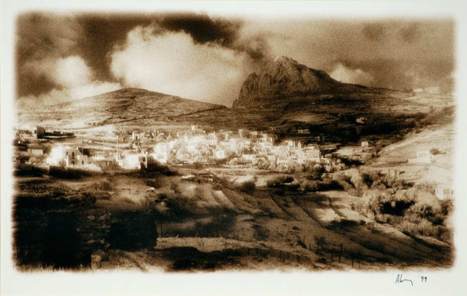 Η χρήση του υπέρυθρου φιλμ, δίνει την ευκαιρία μιας ξεχωριστής καταγραφής των τοπίων της Τηνιακής γης, επιτρέποντας στο φωτογράφο να αποτυπώσει εικόνες ρεαλιστικές με τρόπο υπερρεαλιστικό. Η σχεδόν ασπρόμαυρη φωτογραφία, αποδίδει τα στοιχεία της φύσης και της ανθρώπινης παρουσίας με χρωματισμούς και σκιάσεις πολύ διαφορετικές από εκείνες που προσλαμβάνει ο ανθρώπινος οφθαλμός. Έτσι, ενώ ο φακός καταγράφει με σαφήνεια ότι εμφανίζεται μπροστά στο κλείστρο του, το τελικό αποτέλεσμα μοιάζει να έχει φιλτραριστεί από την μηχανή του χρόνου: Μορφές σε τόνους της σέπιας, με μια ανεπαίσθητη θαμπάδα κι ένα δυνατό φώς που κατεβαίνει απ’ τα λευκά σημεία των ανοιχτών οριζόντων, προσδίδουν στις φωτογραφίες μια νοσταλγική αίσθηση.