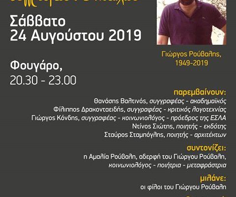 Μια βραδυά αφιερωμένη στον αξέχαστο Γιώργο Ρούβαλη 18/08/2019 // 0 Comments Στο κέντρο τεχνών ΦΟΥΓΑΡΟ στο Ναύπλιο, το επόμενο Σαββάτο 24/8, θα πραγματοποιηθεί εκδήλωση [...]