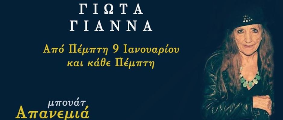 Η Γιώτα Γιάννα ασυμβίβαστη και ετών 90+…στις επάλξεις 27/01/2020 // 0 Comments Μπουάτ Απανεμιά Μνησικλέους και Θόλου 4, Πλάκα τηλ κρατήσεων: 210 32 48580 …Η λέξη καριέρα δεν την [...]